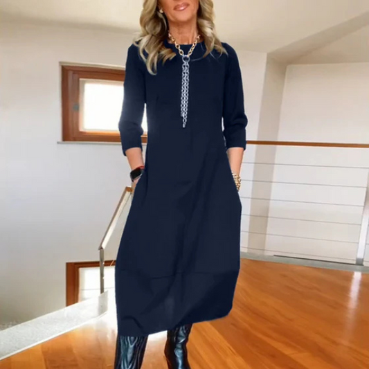 Elegantiška vienspalvė A formos suknelė su kišenėmis ir apvalia iškirpte