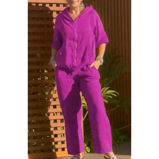Kasdieninis medvilninis-lininis kostiumėlis su gobtuvu