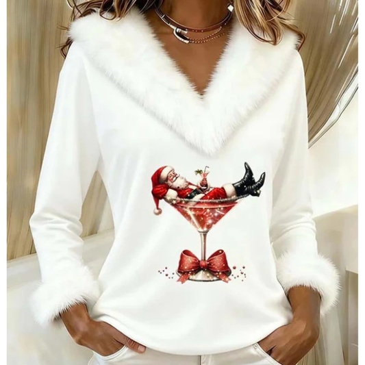 Kalėdinis megztinis su pliušine V formos iškirpte ir spauda