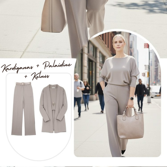 Elegantiškas 3 dalių komplektas su kardiganu, palaidine ir kelnėmis