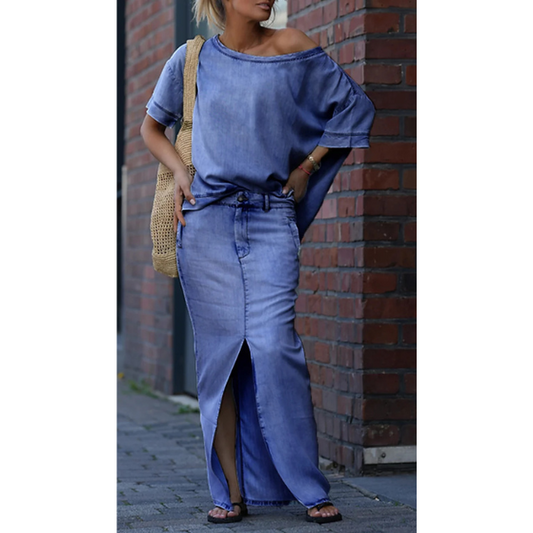 Džinsinis laisvalaikio kostiumėlis su palaidine ir sijonu