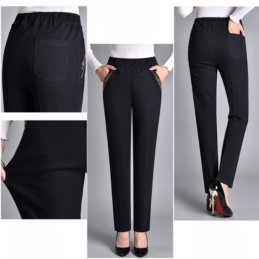 Moteriški džinsai su kišenėmis ir elastingu juosmeniu