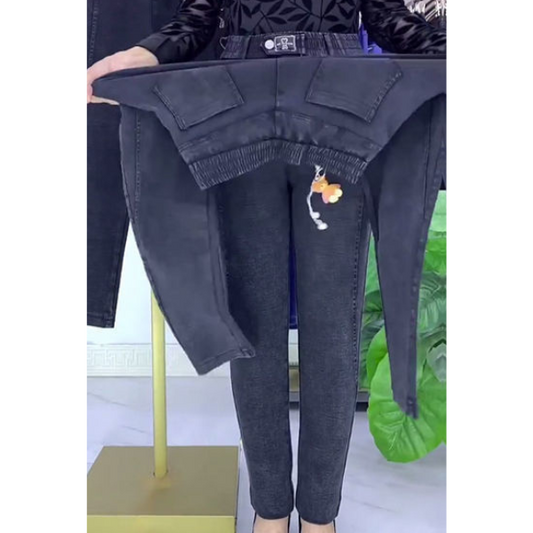 Džinsai su dekoruotomis kišenėmis ir elastingu juosmeniu