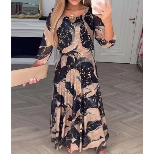 Elegantiška šifoninė suknelė su raštu ir trijų ketvirčių rankovėmis