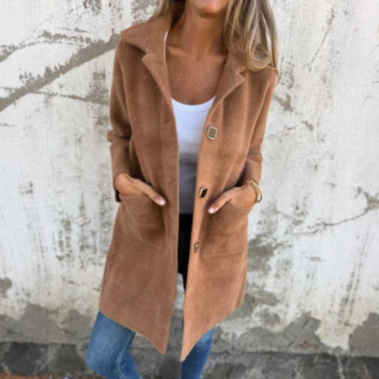 Ilgas moteriškas megztinis su gobtuvu ir skeltuku