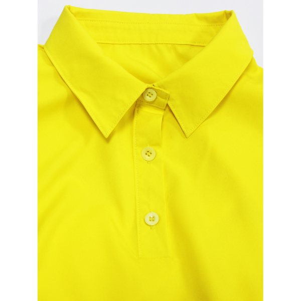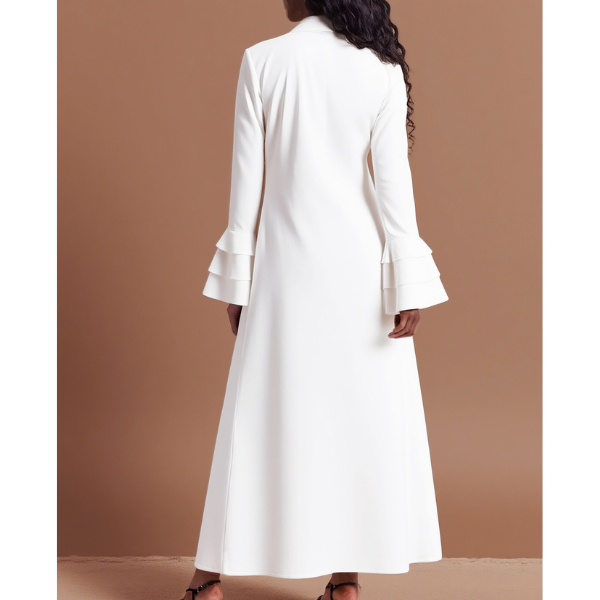 Marškinių dizainas – ši suknelė įkūnija subtilią eleganciją, pasižymėdama klasikinio tipo apykakle ir švelniai krintančia forma, kuri kuria rafinuotą ir išbaigtą įvaizdį.