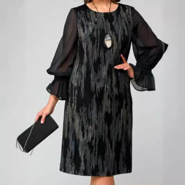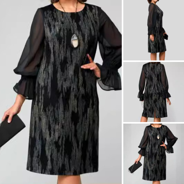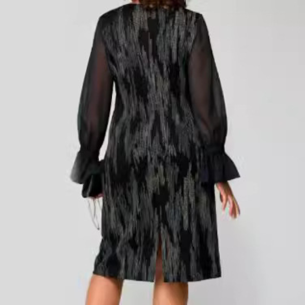 Elegantiškas ir stilingas dizainas – suknelė su 3D efektu ir subtiliais blizgučiais puikiai dera su A formos siluetu, pabrėžiant natūralų moteriškumą.