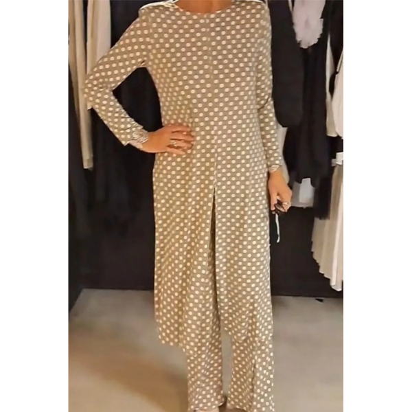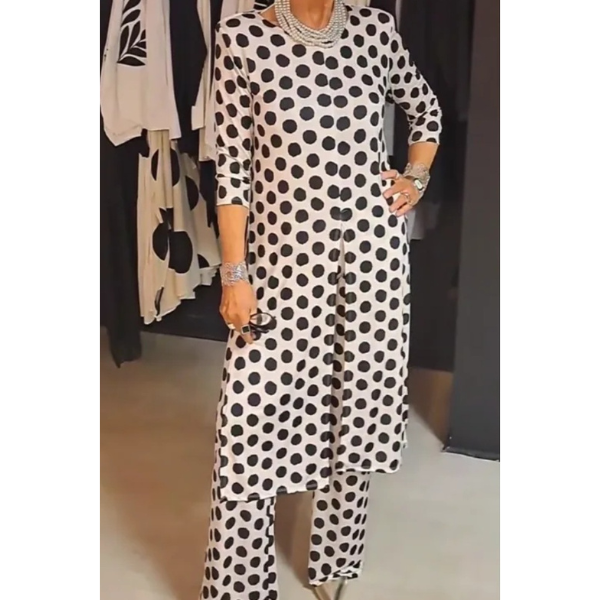 Elegantiškas dviejų dalių taškuotas kostiumas
