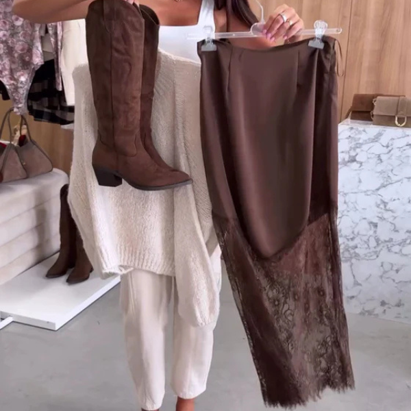 Išskirtinis dizainas – sijonas pagamintas iš satino su nėrinių įsiuvais, kurie suteikia subtilaus elegantiškumo ir moteriškumo jūsų įvaizdžiui.