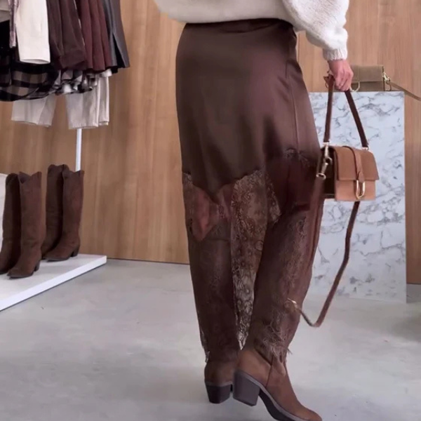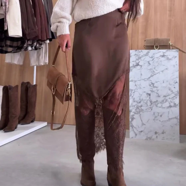 Elegantiškas satino sijonas su nėrinių įsiuvais