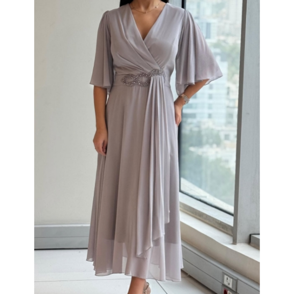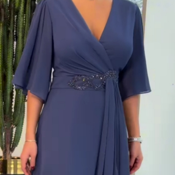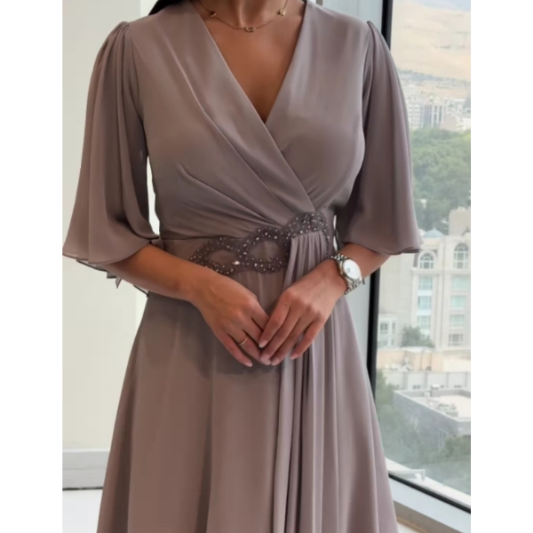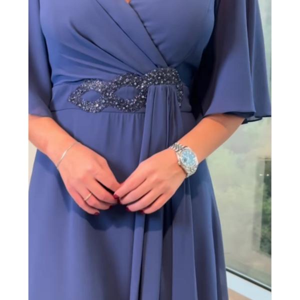 Ilga šifoninė suknelė su V formos iškirpimu ir blizgia detale