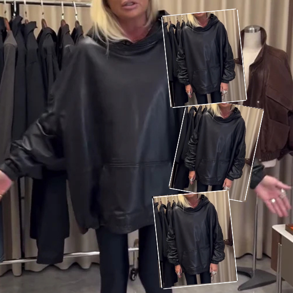 Laisvo kirpimo džemperis iš dirbtinės odos su kapišonu