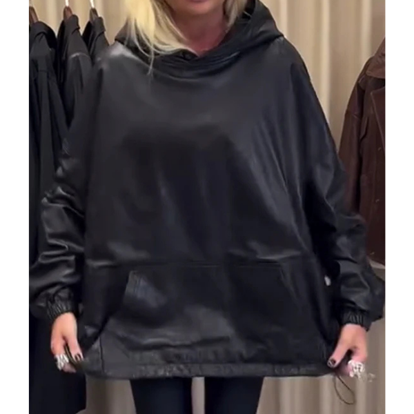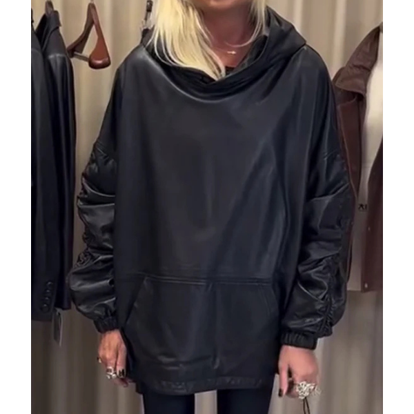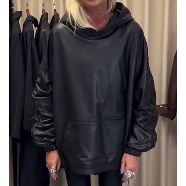 Unikalus dizainas – šis džemperis su kapišonu pagamintas iš dirbtinės odos, kuri suteikia išskirtinį charakterį ir modernų miesto stilių. Laisvas kirpimas pabrėžia laisvę ir pasitikėjimą savimi.