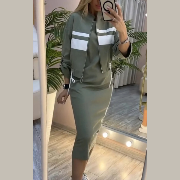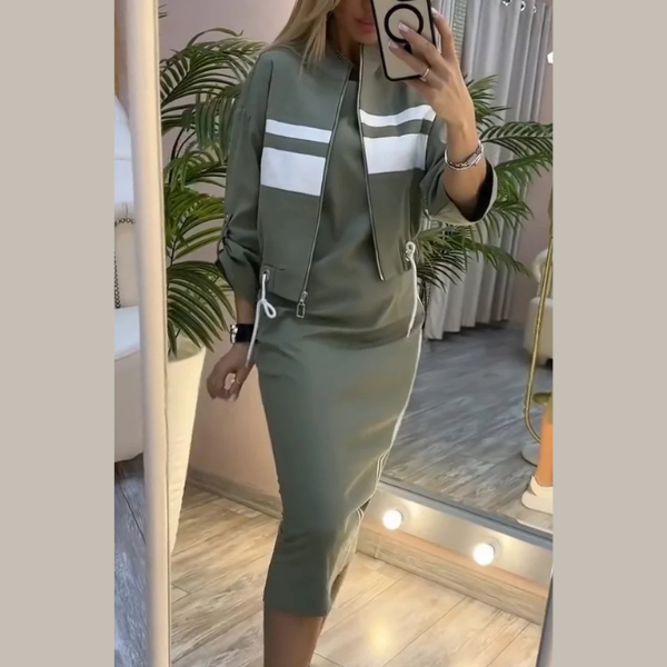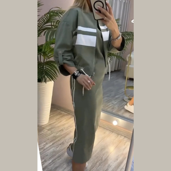 Moteriškas laisvalaikio komplektas – aptempta suknelė ir megztukas su užtrauktuku