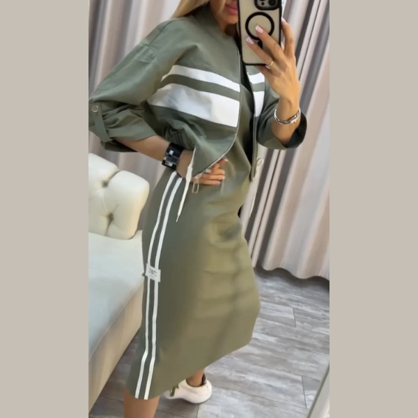 Modernus sportiškas akcentas – megztuko baltos juostelės ir užtrauktukas suteikia šiuolaikiškumo, o vienspalvė suknelė išlaiko moterišką subtilumą bei eleganciją.