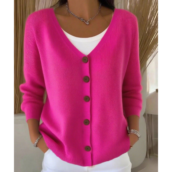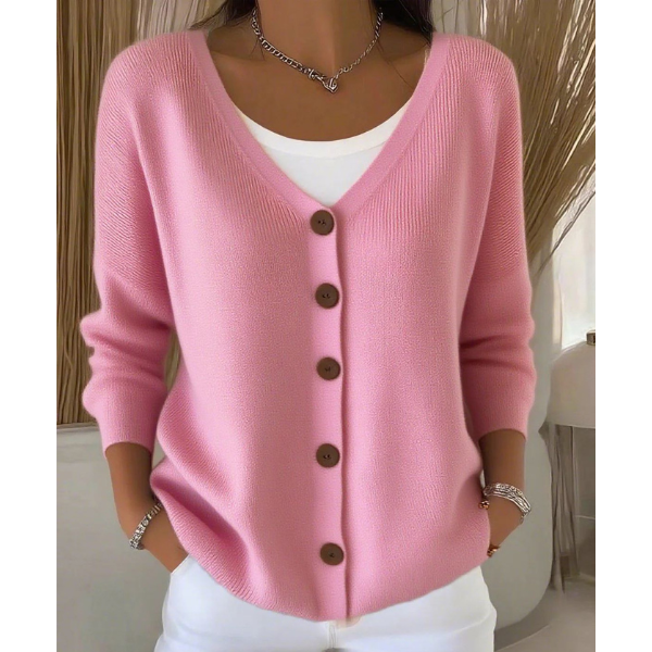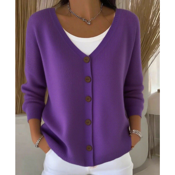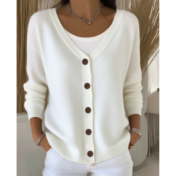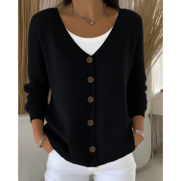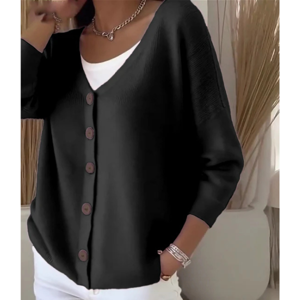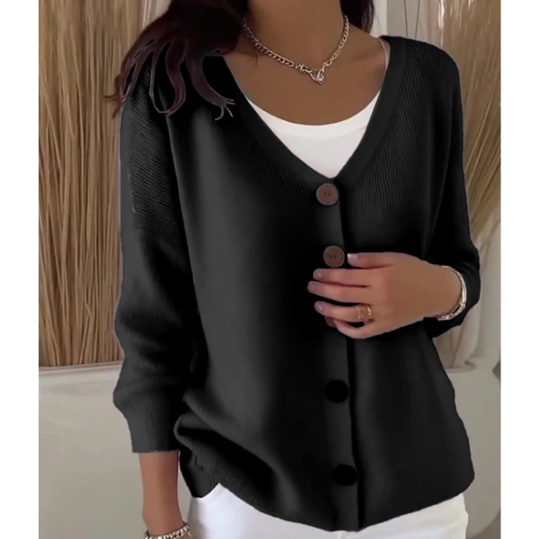 Universalus dizainas – megztinis su sagomis ir subtiliu V formos iškirpimu puikiai tinka tiek kasdienai, tiek laisvalaikiui, suteikdamas dailų ir tvarkingą įvaizdį.