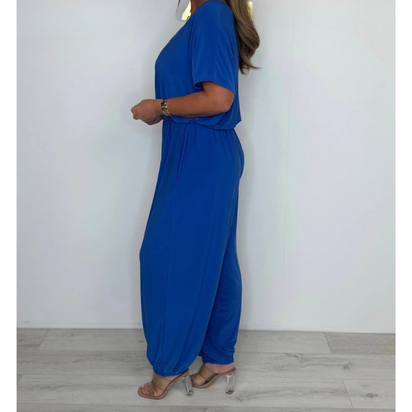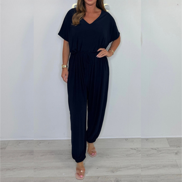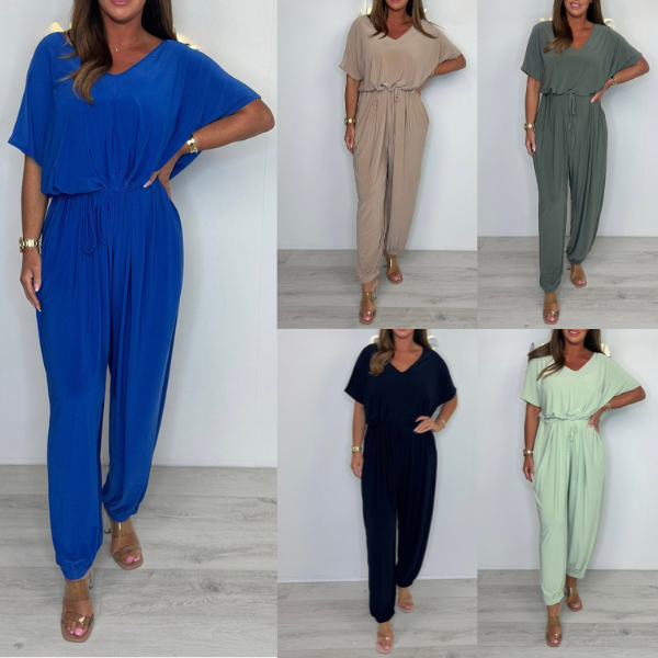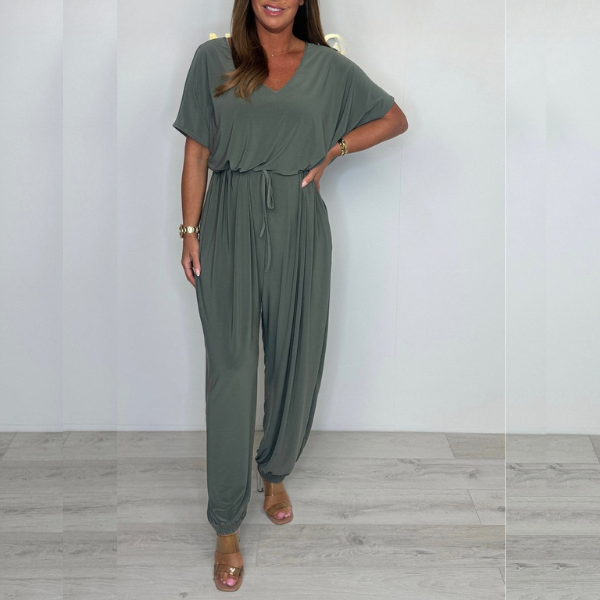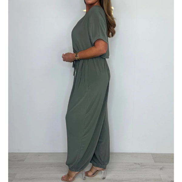 Patogus juosmens surišimas – reguliuojamas juosmens dirželis leidžia priderinti kombinezoną pagal figūrą, išryškinant siluetą.